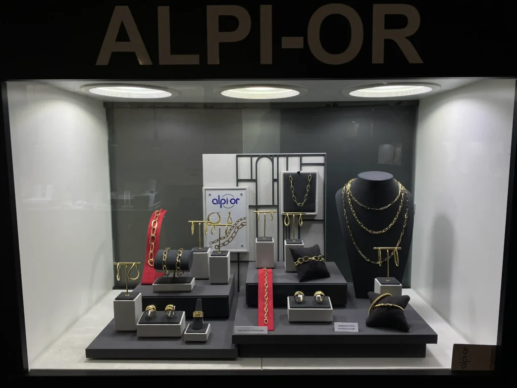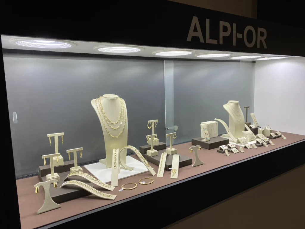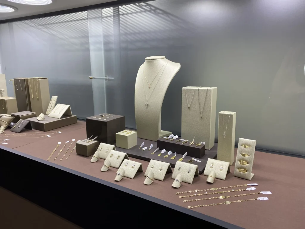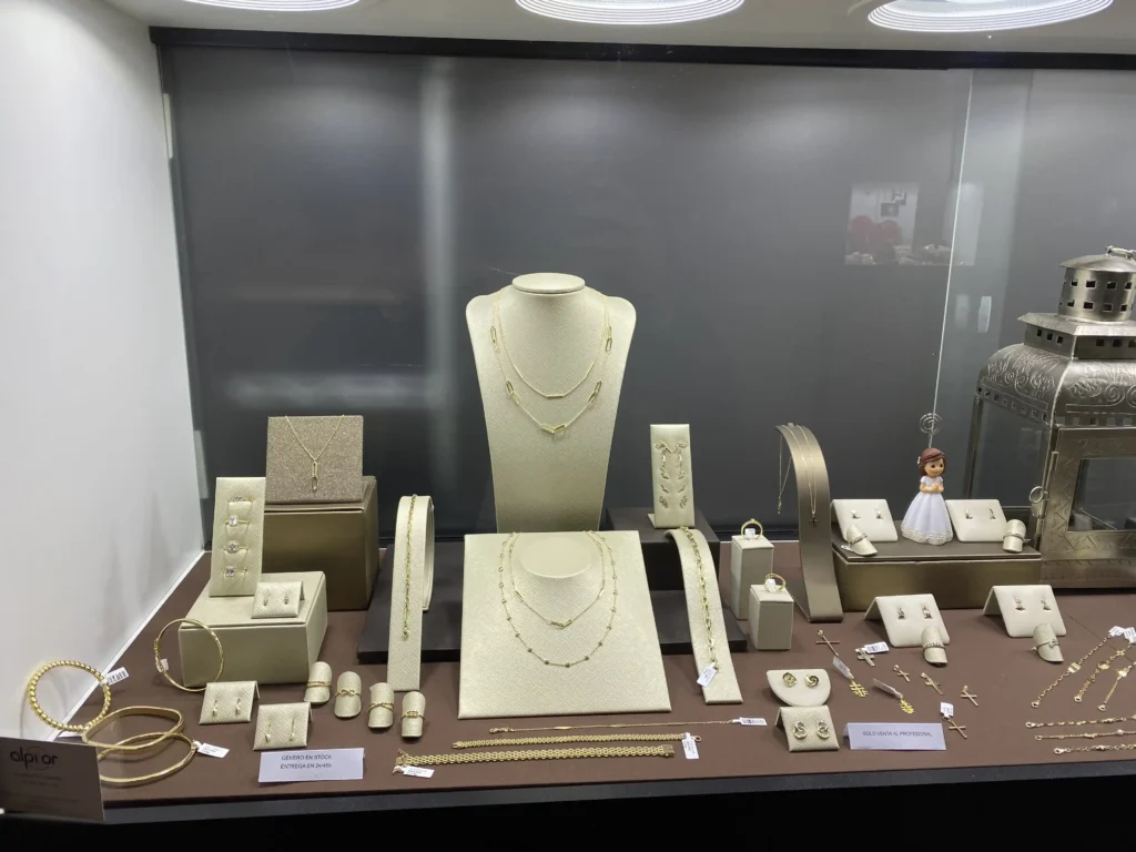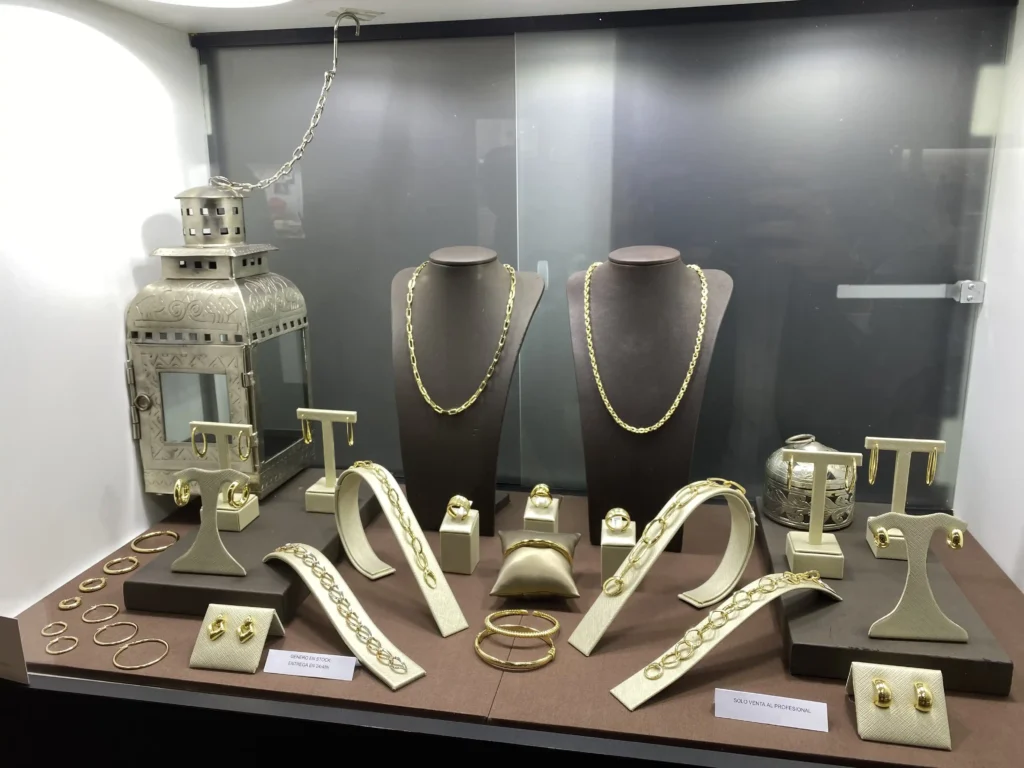 Pulseras huecas oro amarillo, anillos de volumen y cadenas.
